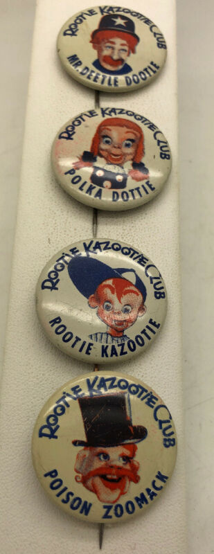 Title (ebay affiliate link): Set 4 Rootie Kazootie Club Pins Polka Dottie Poison Zoomack Mr Deetle Dootle 50s