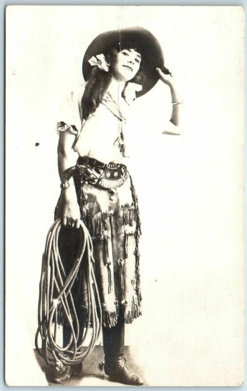 Title (ebay affiliate link): Vintage 1920s COWGIRL Real Photo RPPC Postcard Sexy Girl Cowboy Outfit w/ Rope