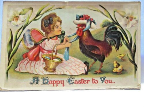 Title (ebay affiliate link): 1910 POSTCARD A HAPPY EASTER TO YOU, GIRL TYING BONNET ON ROOSTER