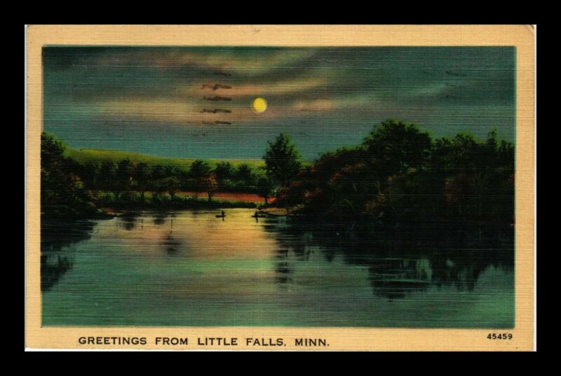 Title (ebay affiliate link): US POSTCARD LINEN GREETINGS FROM LITTLE FALLS MINNESOTA MOONLIGHT RIVER SCENE