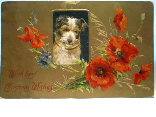 1907 POSTCARD WITH BEST CHRISTMAS WISHES, PORTRAIT OF DOG, RED POPPIES