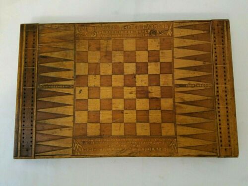 Antique Advertising Game Board Checkers Chess Cribbage Wood Box