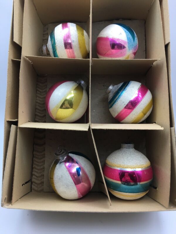 Title (ebay affiliate link): 6 Vintage West Germany Pink Blue Mica Stripes Christmas Ornaments Plastic Caps