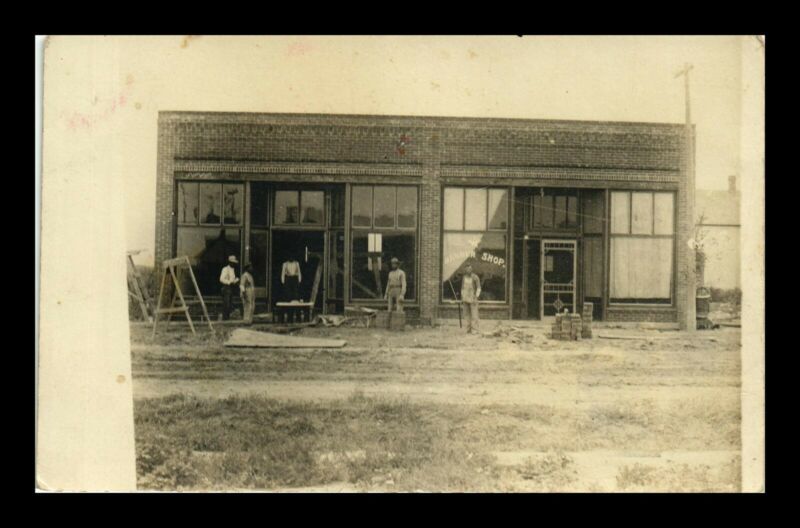 Title (ebay affiliate link): US POSTCARD BULDING WITH BARBER SHOP SIGN FOUR MEN STANDING IN FRONT RPPC