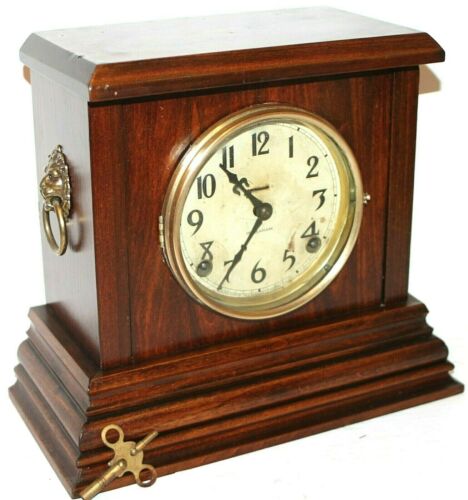 Title (ebay affiliate link): ANTIQUE INGRAHAM MANTEL CLOCK W/ LION HEAD SIDE HANDLES & CATHEDRAL GONG STRIKE.