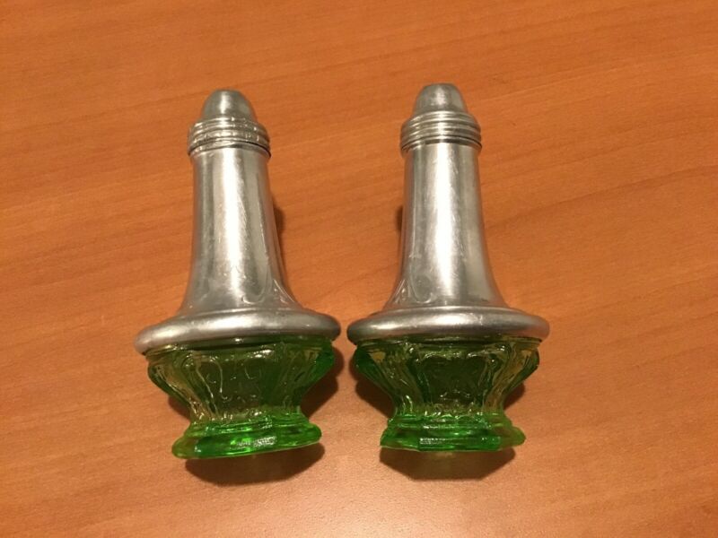 Vintage Aluminum Green Depression Glass Salt and Pepper Shaker Set PCAB7