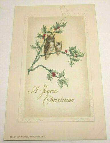 VINTAGE CHRISTMAS POSTCARD BY WINSCH, OWLS IN TREE EMBOSSED 1914 POSTED