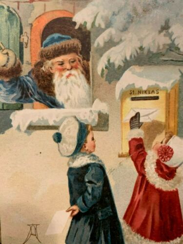 Vtg Christmas Postcard SANTA BLUE COAT CAP St. Niklas Mailbox Children GERMANY