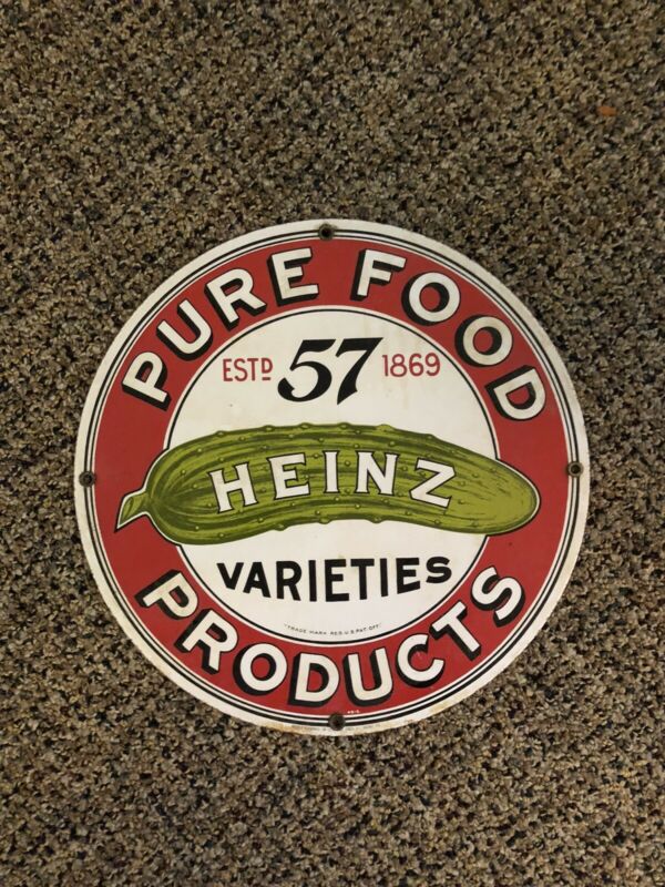 Title (ebay affiliate link): 1983 Ande Rooney Porcelain Pure Food Products Heinz 57 Pickle Sign 11 1/4"