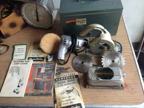 Title (ebay affiliate link): Vintage 1950s Black & Decker Saw, Drill, and Sand Kit in Original Metal Case.