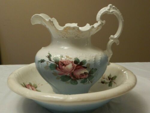 Title (ebay affiliate link): Antique Victorian Pitcher Wash Bowl Set Blue w/ Roses embossed Ironstone