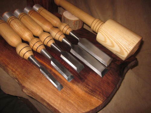 Title (ebay affiliate link): 5 Piece Ash Timber Frame Wood Chisel Set with 16oz Carving / Striking Mallet