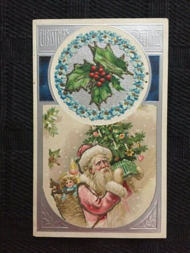 Antique Christmas Postcard - glitter/Santa/holly
