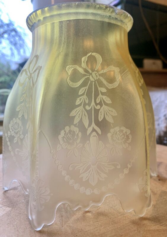 Title (ebay affiliate link): A LOVELY ETCHED Light Green And Clear Glass TWIN DUPLEX OIL LAMP SHADE.