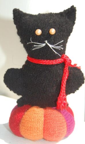 Pincushion Primitive Halloween Felted Wool Cat on Pumpkin Pin Cushion Make Do