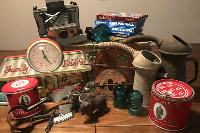 Title (ebay affiliate link): Vintage Antique JUNK DRAWER LOT Oil Cans POLAROID Clock REVERSIBLE SPINDLES More