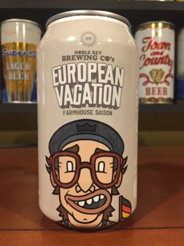 Title (ebay affiliate link): EUROPEAN VACATION Farmhouse Saison Beer Can, NOBLE REY BREWING, Dallas, Texas