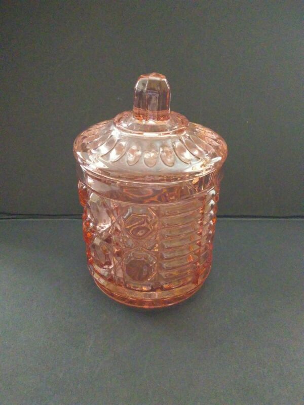 Title (ebay affiliate link): Vintage 5" Tall Pink Depression Glass Sugar or Jam Jar with Lid No Spoon