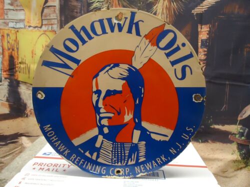 OLD 1957 VINTAGE MOHAWK OILS PORCELAIN ENAMEL GAS PUMP SIGN NEWARK, N.J. USA