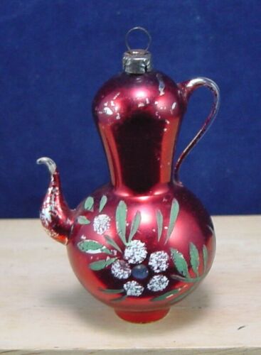 TEA POT GLASS GERMAN FEATHER TREE ORNAMENT RED WITH FLOWERS ANTIQUE