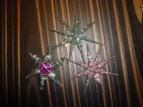 3 Vintage Antique German Tinsel Wire Star Christmas Ornaments Pink Blue silver