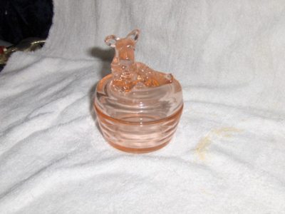 Title (ebay affiliate link): Pink Depression Glass Dog Covered Candy Powder Bowl
