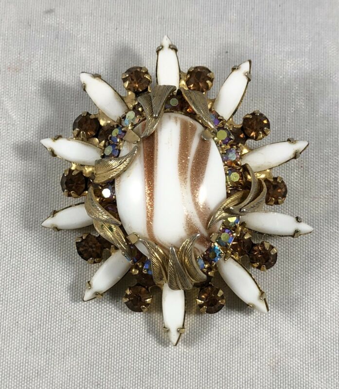 Title (ebay affiliate link): Vintage Tiered Prong Set Milk Glass Aurora Borealis Rhinestone Brooch