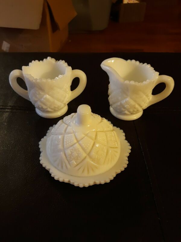 Title (ebay affiliate link): Westmoreland "Thumbelina" Milk Glass Full Set Of 3 Childrens Table Set. Scarce!