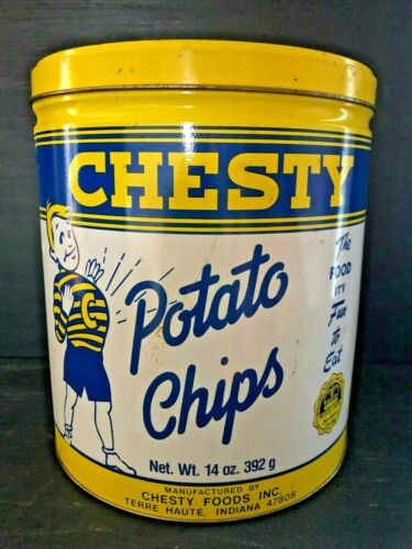 Title (ebay affiliate link): Vintage Chesty POTATO Chip Tin Can 40th Anniversary Terre Haute , Indiana.