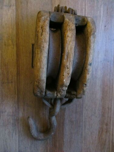 Title (ebay affiliate link): Antique LARGE Wooden Double Block Tackle Pulley w/hood farm barn nautical decor