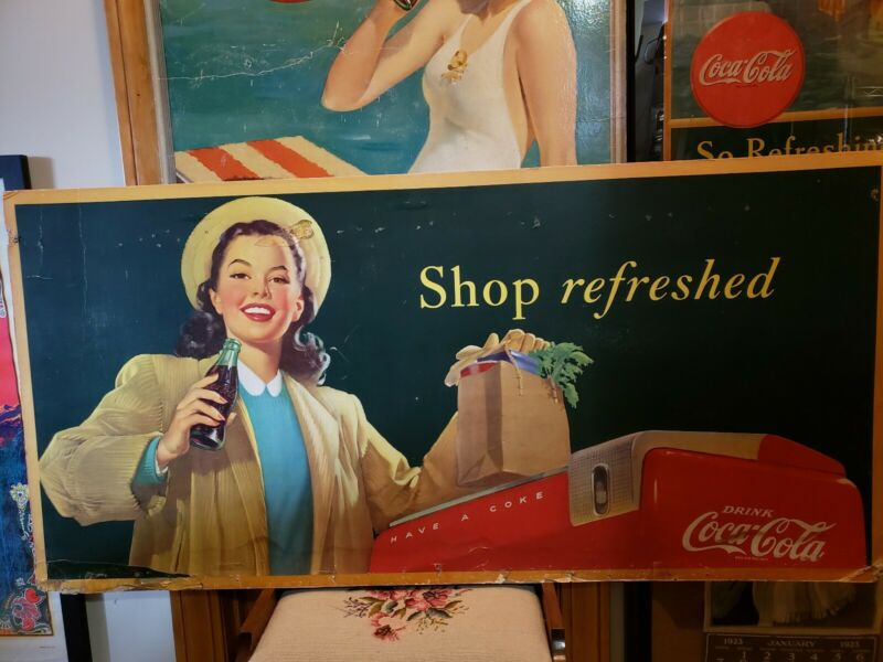 Title (ebay affiliate link): Vintage Post WWII 1948 Coca Cola Cardboard Sign Antique Soda Fountain Diner