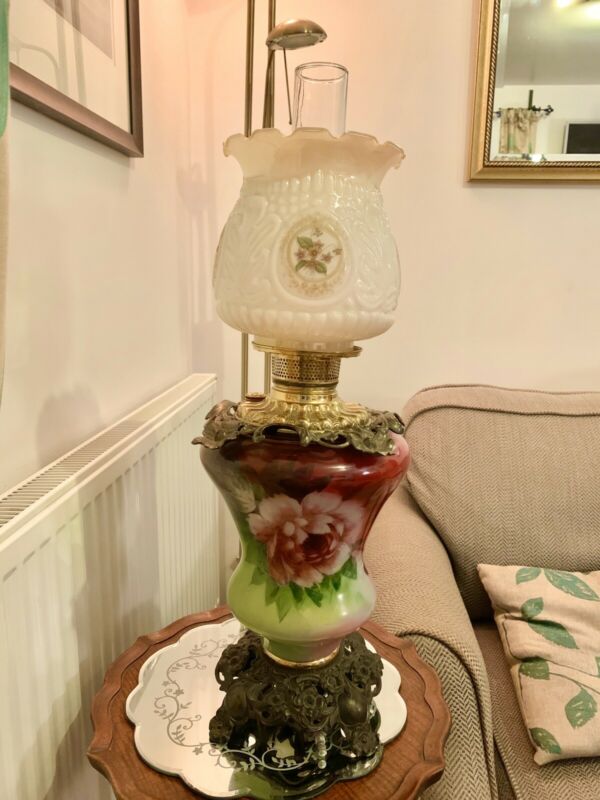 Title (ebay affiliate link): Hand Painted Electric Lamp Made In USA Early 20th Century Glass Shade & Chimney