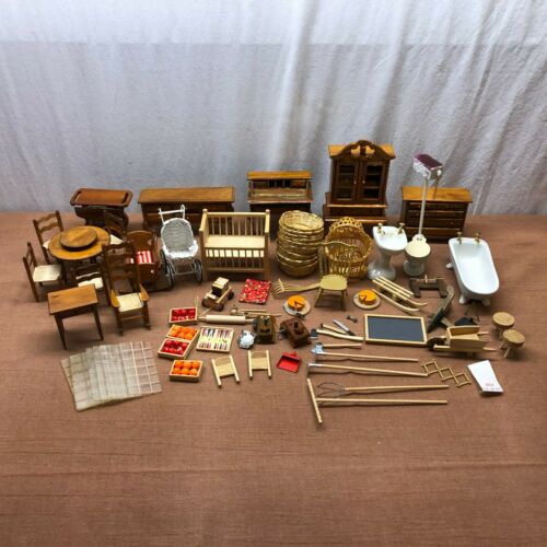 HUGE Vintage Dollhouse Miniature Lot -Furniture Food Bathroom Crib Garden 50+pcs
