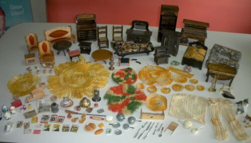 Title (ebay affiliate link): Lot Vintage Dollhouse Wooden Furniture, Accessories, Handmade Rugs, etc.