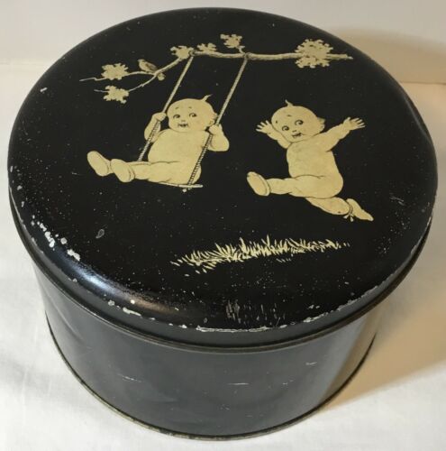 Title (ebay affiliate link): Vtg Kewpie Doll Tin 2 Kewpies Playing Swinging From Tree Branch Black, Round Tin