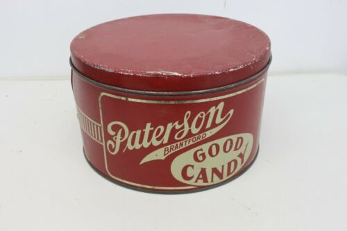 Title (ebay affiliate link): Vintage Paterson Brantford Good Candy Metal Tin Can Red Advertising Store Decor