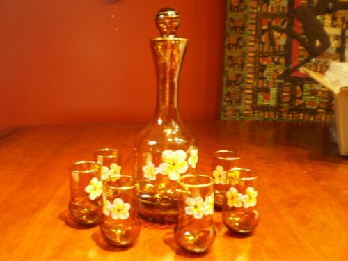 Vintage amber blown glass yellow, white, gold painted wine decanter set, 8pc.