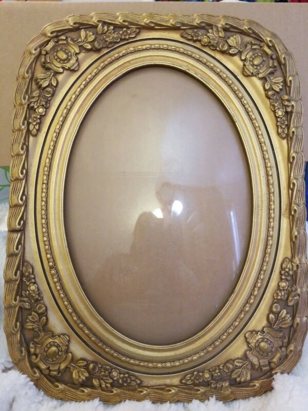 Vintage Wood Ornate Oval Picture Frame Convex Bubble Dome Glass 17"x12.5"