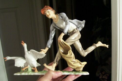 alka kunst bavarian porcelain large figurine of a goose catcher signed . bockman