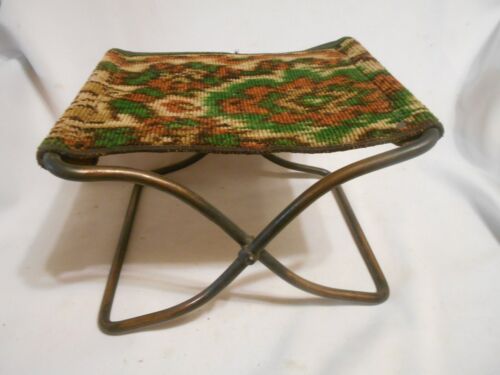 vintage antique folding foot stool needlework / tapestry top steel folding legs