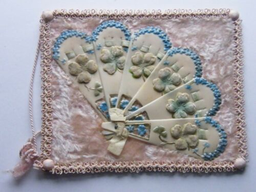 Ornate Antique Victorian Vtg Xmas Card CELLULOID Hand Fan Flowers Shamrock Lace