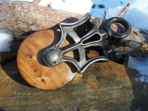 Title (ebay affiliate link): Antique VINTAGE CAST Iron/ WOOD PULLEY PRIMITIVE FARM TOOL ORNATE RUSTIC DECOR
