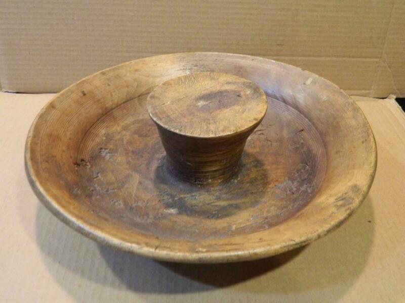 Primitive Large Turned Wood Bowl w/ Raised Chopping Block Center Nuts ? Antique