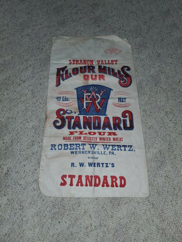 Title (ebay affiliate link): Vntg 1900s Wertz Milling Co Wernersville, PA 49lb Cloth Flour Bag Red White Blue