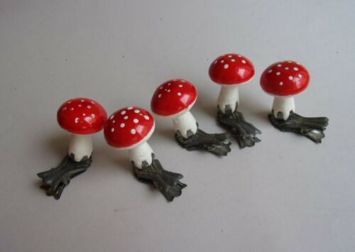 Lot of 5 Vintage CLIP-ON SPUN COTTON MUSHROOMS CHRISTMAS ORNAMENTS