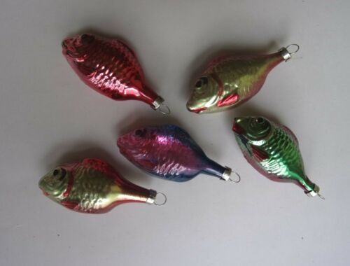 Lot of 5 Vintage Czechoslovakia BLOWN GLASS FISH CHRISTMAS ORNAMENTS