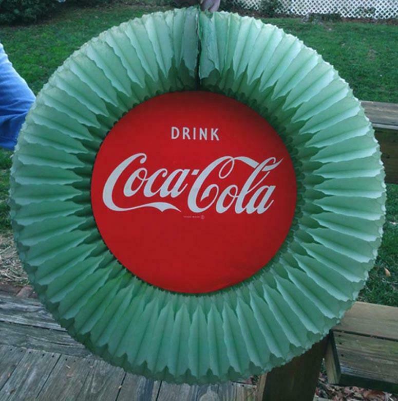 Title (ebay affiliate link): Vintage Coca Cola Christmas Expandable Tissue Wreath Double Sided Button Minty