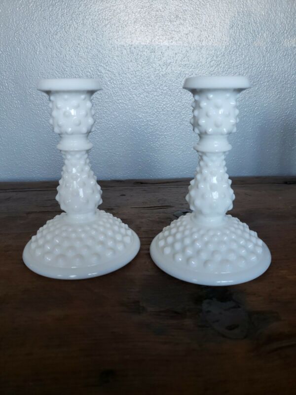 Title (ebay affiliate link): Vintage Fenton Milk glass Hobnail 6" Candle Stick Holder One Pair