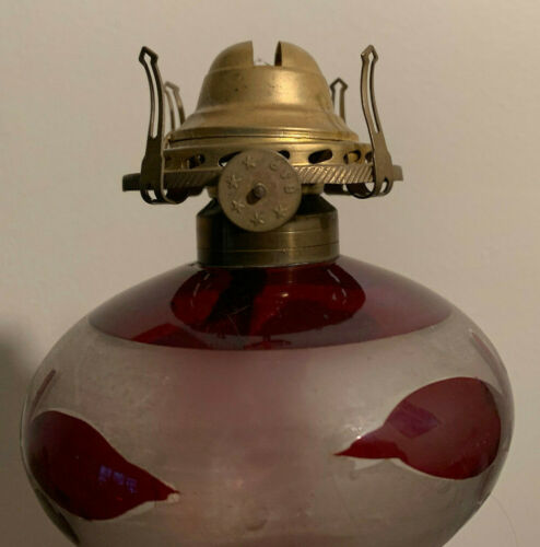 Title (ebay affiliate link): Vintage Cranberry Flash Oil Lamp Font with Milk Glass Base