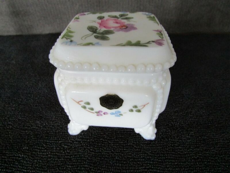 Title (ebay affiliate link): Westmorland Milk Glass Hand Decorated Jewel Box Original Labels D-53